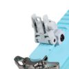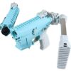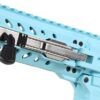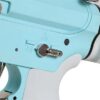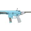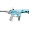 Color azul claro, con toques gris y piezas plateadas, cuerpo y guardamanos polímero con nylon, sistema de plegado total, es decir culata y cañón, guardamanos tipo M-LOK con palanca de seguro de plegado, riel superior continuo picatinny 20mm para accesorios y miras.